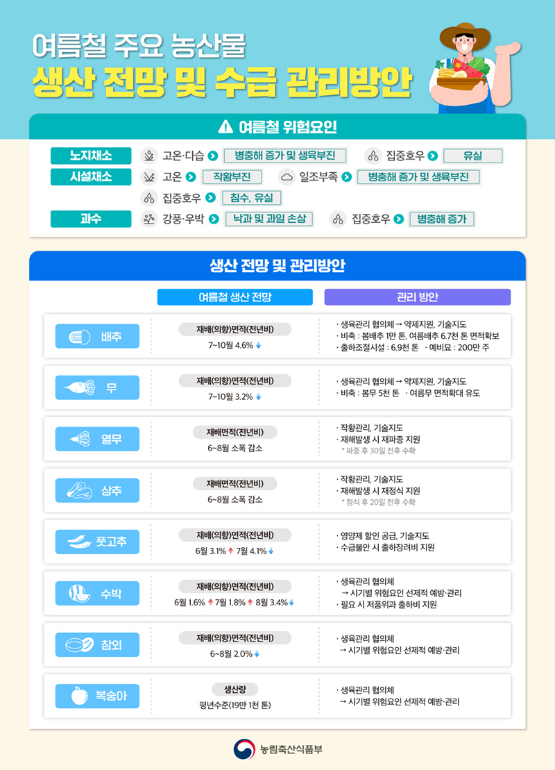 농식품부는 농협·농진청 등과 협력해 여름철 주산지 작황 점검과 기술 지도를 지속적으로 추진할 방침이다. 집중호우에 따른 침수피해 등의 재해 예방에 힘쓰고 불가피하게 재해를 입을 경우 신속한 생산과 출하 재개가 가능하도록 재파종비, 출하장려금 지원 등을 추진하기로 했다.