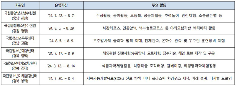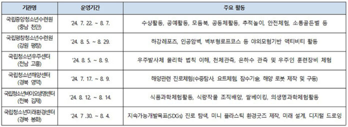 한편 이같은 여름방학 청소년활동 프로그램은 청소년활동정보서비스인 ‘이(e)청소년 누리집’과 모바일 앱에서 손쉽게 확인할 수 있다.